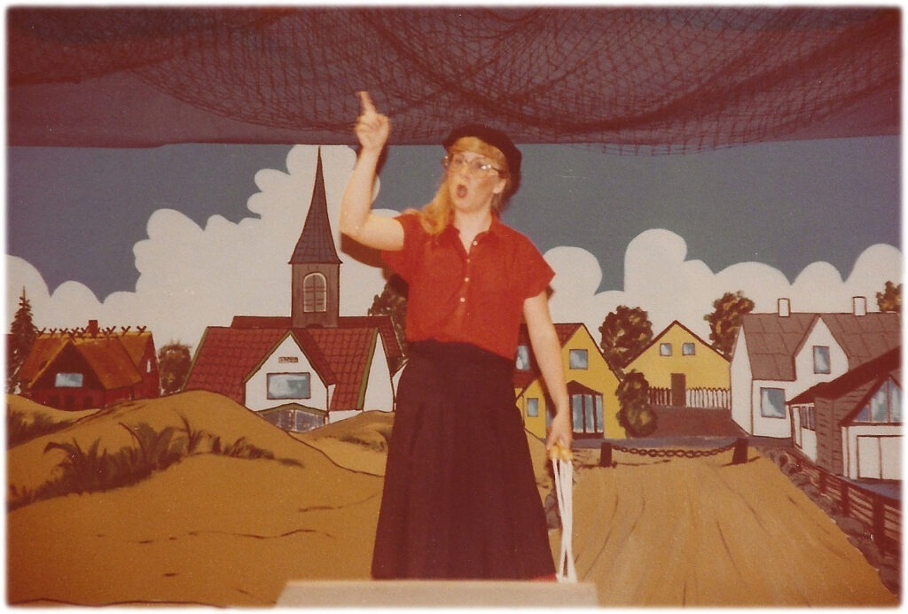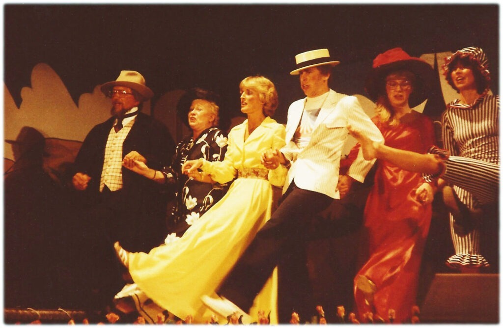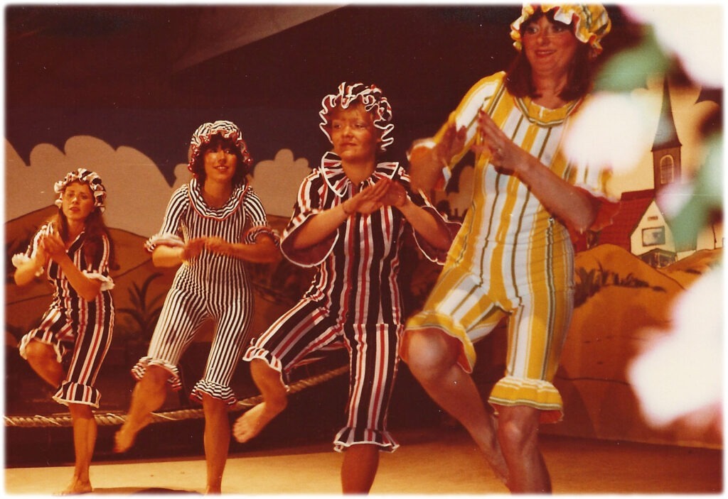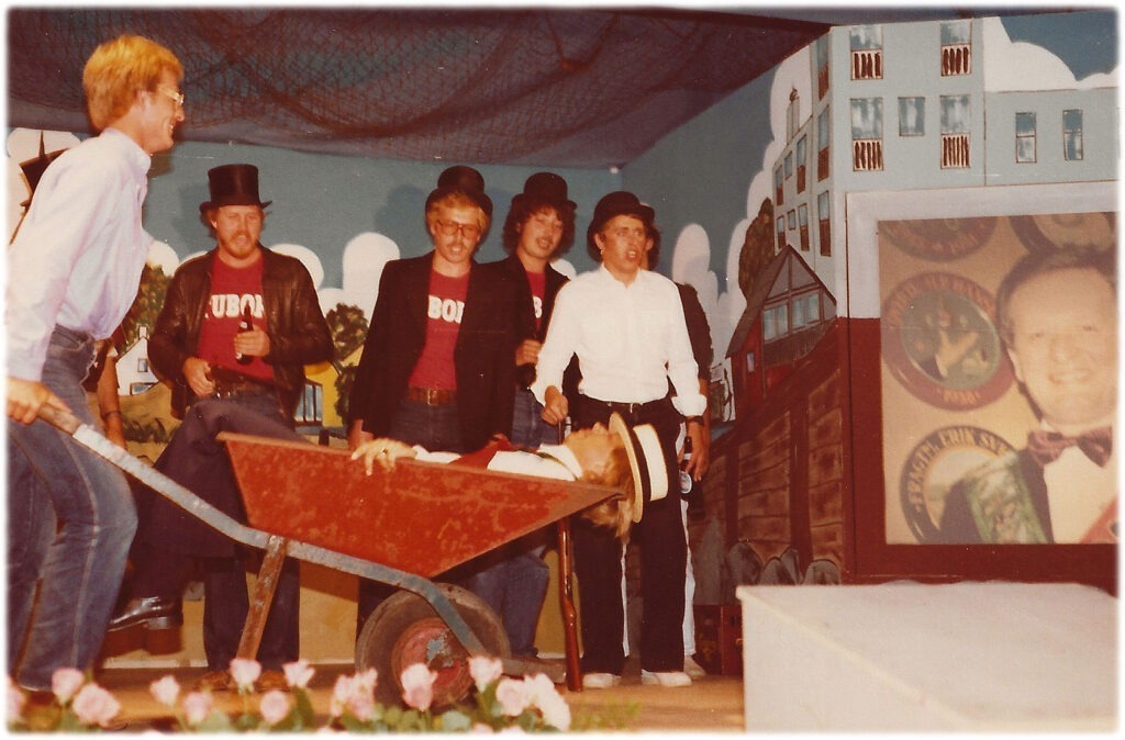 Vi er i besiddelse af mange flotte fotos fra revyen – venligst udlånt af Jørgen Haagen – og fotografen er desværre ikke kendt, hvor man fornemmer den flotte og vedkommende revy i den dengang nyopførte gymnastiksal.
