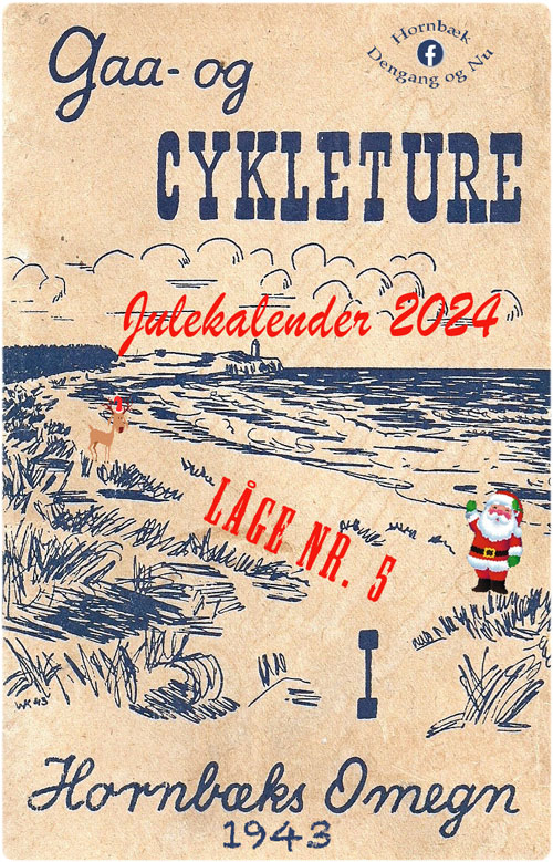 Velkommen til Julekalenderen 2024, hvor I, de næste 14 dage op til Juleaften, kan åbne en låge og læse lidt omkring Hornbæk Turistforeninges forslag til – GÅ OG CYKLETURE – til, i og omkring Hornbæk. Guiden er fra foråret 1943 under 2. Verdenskrig og er et forsøg på dengang at lokke sommerturister til Hornbæk. Teksterne til turene er skrevet af forfatterinden Fru Inger Bentzon (1886 – 1971) mangeårig sommergæst i det Bentzonske sommerhus “Kullahus” på Kystvej 4 og senere bosiddende på Ndr. Strandvej i Horneby Sand til sin død.