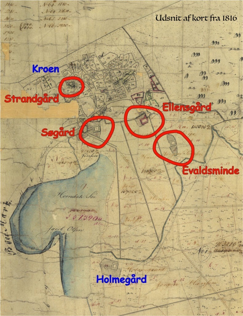 På kortet fra 1816 – det ældste kort over området – kan man se de fire gårde – hertil Holmegård og Sandgård (i dag Hornbækgård) – den sidste ligger lige øst for kortudsnittet.