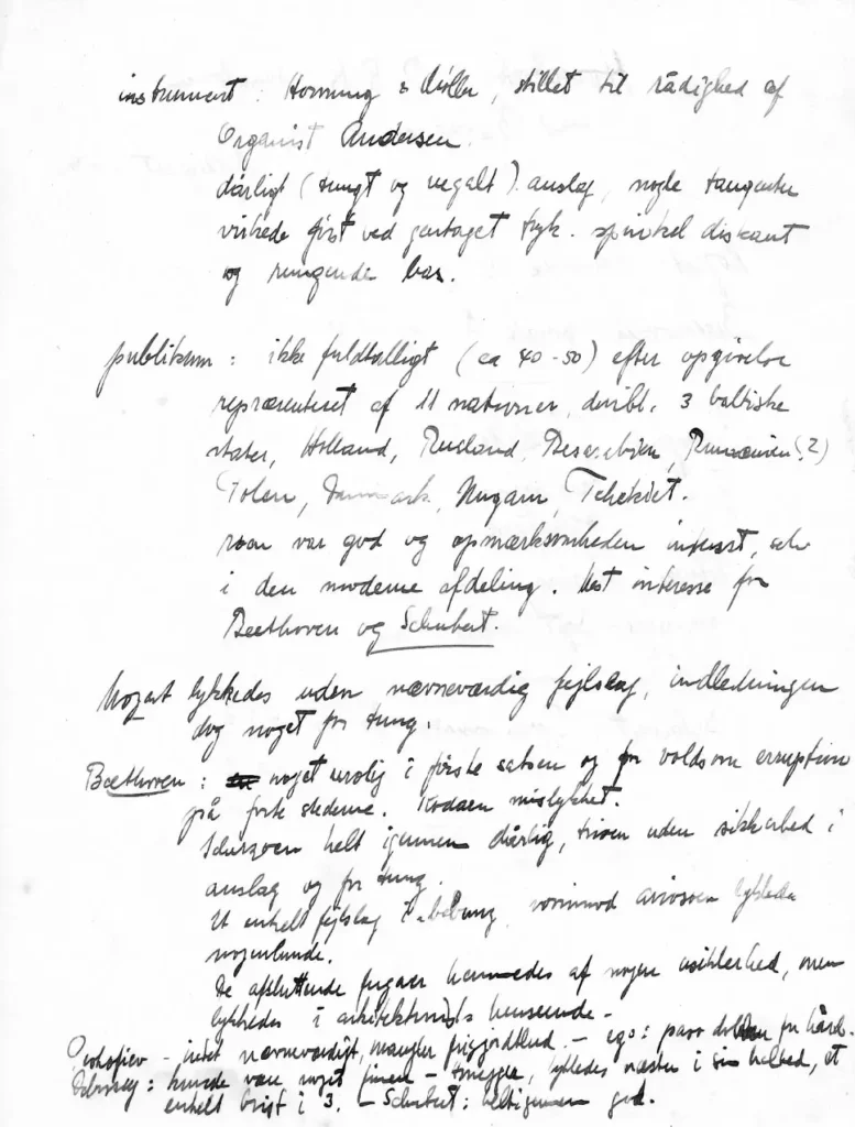 Hornung&Møller flyglet, som var stillet til rådighed af organist Frede Andersen, var han bestemt ikke tilfreds med: anslaget var dårligt (tungt og uegalt), nogle tangenter virkede først ved gentaget tryk, diskanten var spinkel og bassen rungede. Uden at skyde skylden på flyglet var han – vanen tro – også ret kritisk over for sin egen indsats ved flyglet.