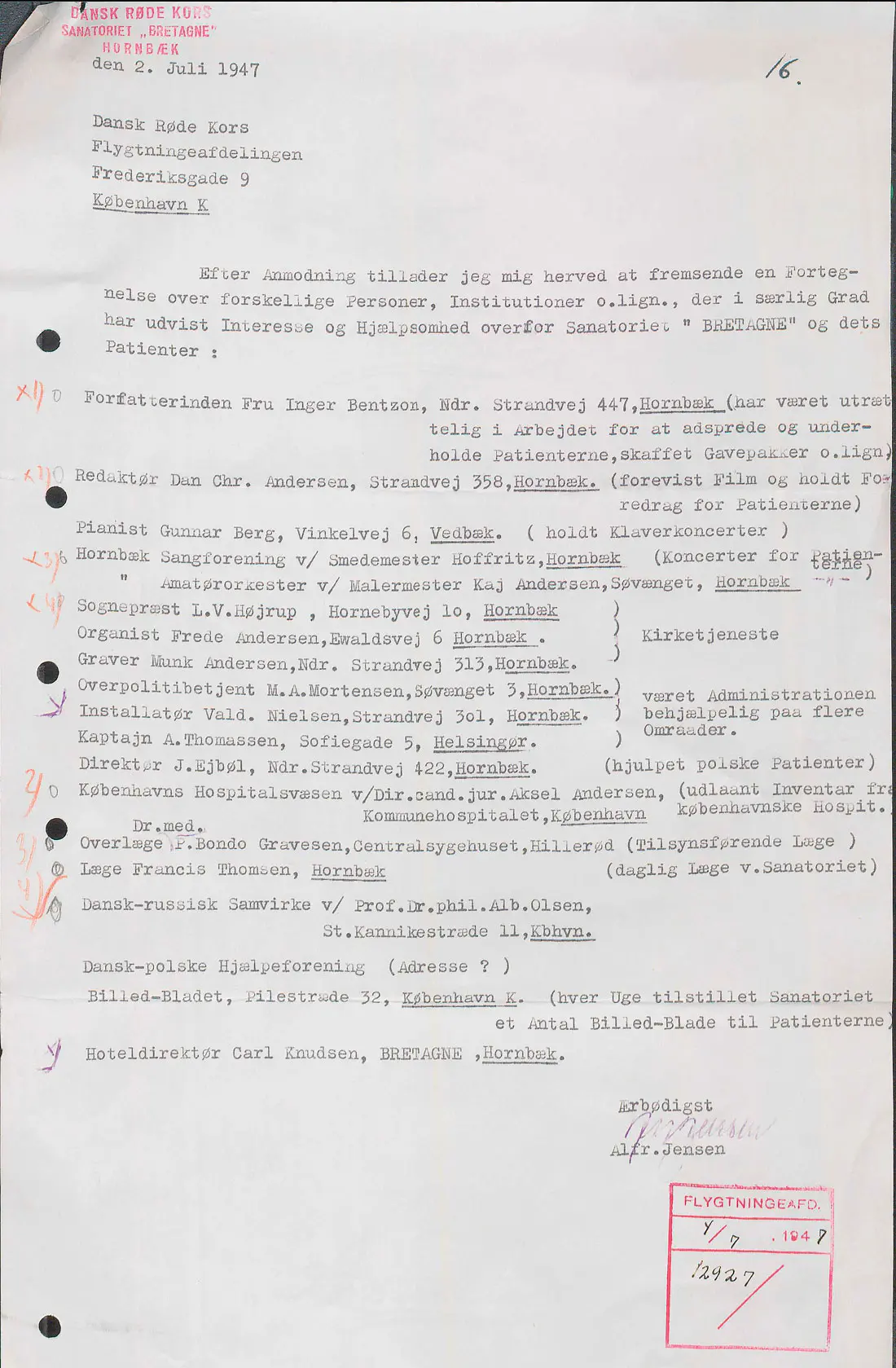 Endda i betydeligt omfang, som det fremgår af et brev den 2. juli 1947 til Røde Kors’ Flygtningeafdeling med en navneliste på 19 personer og institutioner, som i særlig grad har udvist interesse og hjælpsomhed over for sanatoriet og dets patienter.