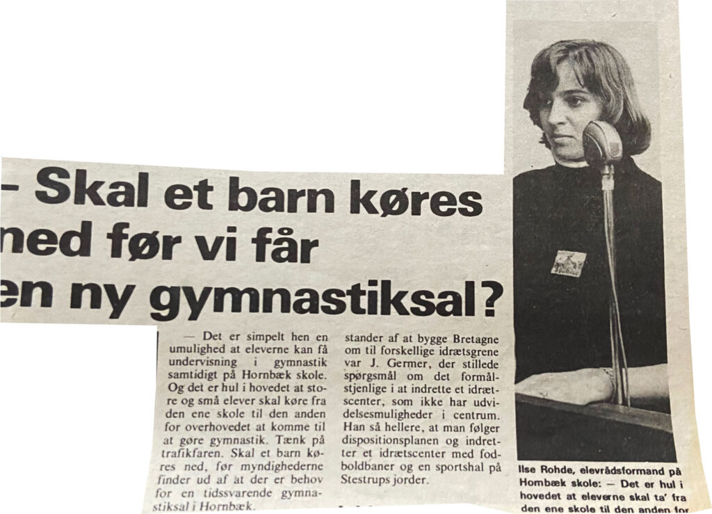 I 70’erne har Hornbæk to skoler – Den gamle Skole (nuværende PUK) og så den Den ny skole (men ikke udbygget som den er i dag). Der er to gymnastiksale, en ved hver skole, så børnene må gå ad Sauntevej til og fra gymnastik. Mange er bekymret for, at der kan ske en ulykke.