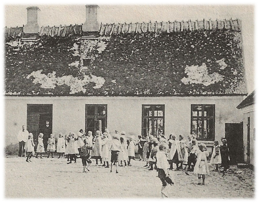 Man aner nedgangen til Skolen bagest med den stråtækte skolebygning.