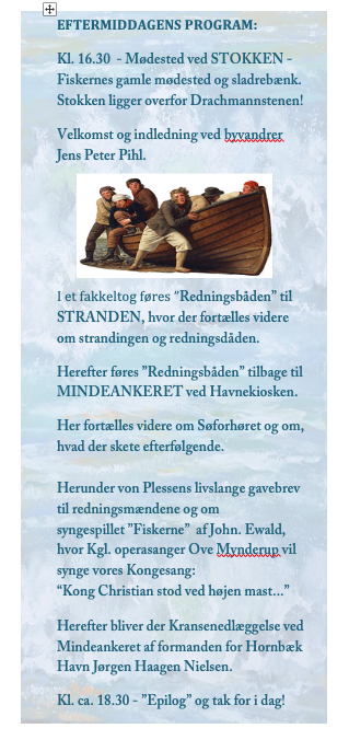 Der var til dagen bygget en redningsbåd – kopi af båden fra C. W. Eckersberg maleri om redningsdåden – som blev båret til stranden af 5 lokale Hornbækkere udklædte som datidens fiskere. Efter “redningen” på stranden bar de båden tilbage til Mindeankeret, hvor arrangementet sluttede med fortælling, operasang – “Kong Christian stod…” og kranselægning ved Mindeankeret.